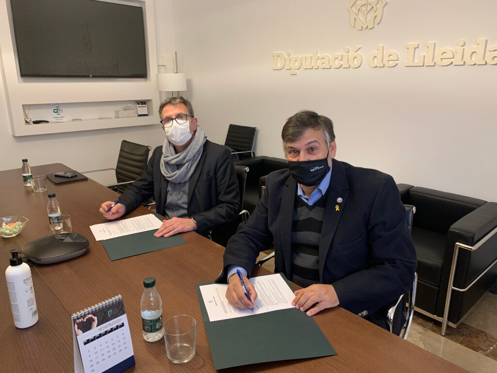 El president de la Diputació de Lleida, Joan Talarn, i el coordinador nacional de la Unió de Pagesos de Catalunya (UP), Joan Caball, han signat aquest dijous el conveni per regular la col·laboració entre ambdues institucions, als efectes que l’entitat desenvolupi tres projectes especínfics d’interès social i sanitari per a la població. La suma de les tres accions suposa una aportació global de la Diputació de Lleida de 103.000 euros.