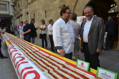 El president de la Diputació de Lleida, Joan Reñé, ha assitit aquest divendres a l’acte solidari organitzat pel Gremi de Forners de les Terres de Lleida i que ha consistit en l’elaboració i exhibició d’una coca de 25 metres de llarg que serà lliurada al Banc dels Aliments.